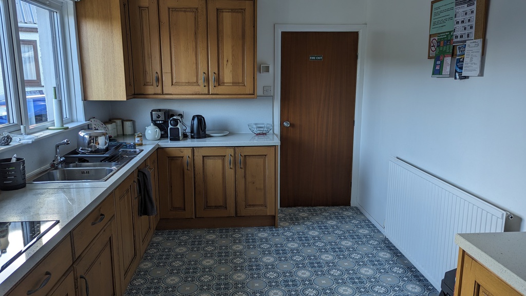 The kitchen is spacious, well equipped for all your catering needs and there’s plenty of room to sit around the dining table to talk about the day’s activities.